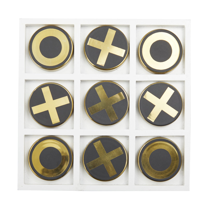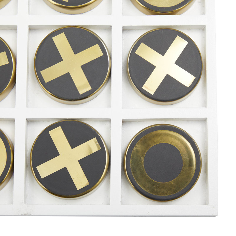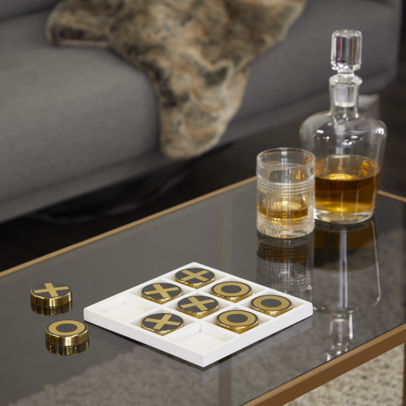 The tabletop tic tac toe game features the classy combination of black and gold against a white background