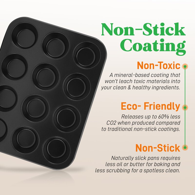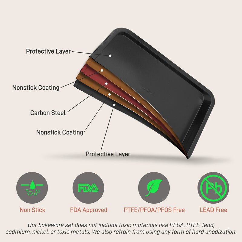 Heavy-gauge carbon steel coated with a safe non-stick material (PTFE) – top-quality carbon steel ensures that these baking supplies remain rust-free while the nonstick coating allows food to slide on and off and eliminates the need for cooking spray. Unlike other nonstick cookware