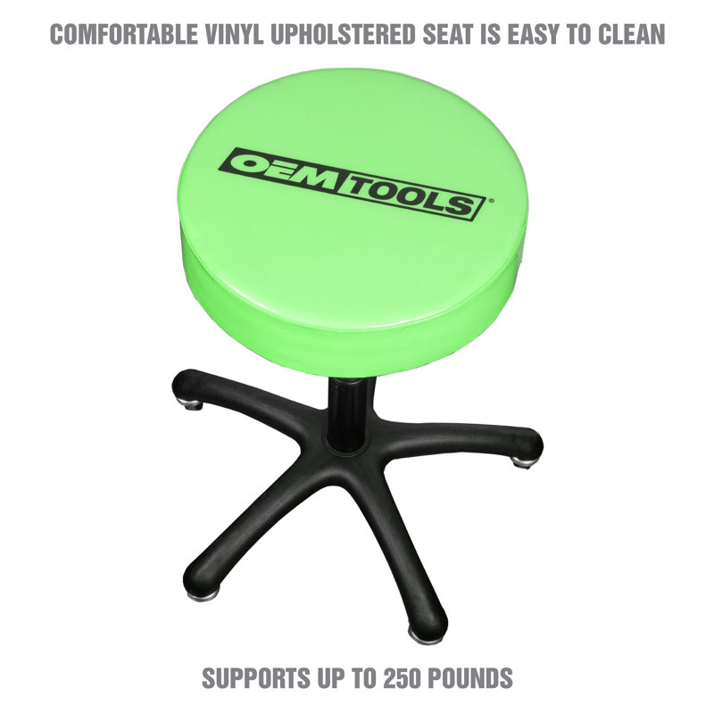 The multi-purpose pneumatic rolling stool can adjust from 20″ to 26″ in height. Covered in reinforced vinyl upholstery for longevity and to reduce wear and tear. The vinyl also makes it easy to clean with just a simple wipe. The heavy duty pneumatic rolling stool is built to hold up to 250 Lb.