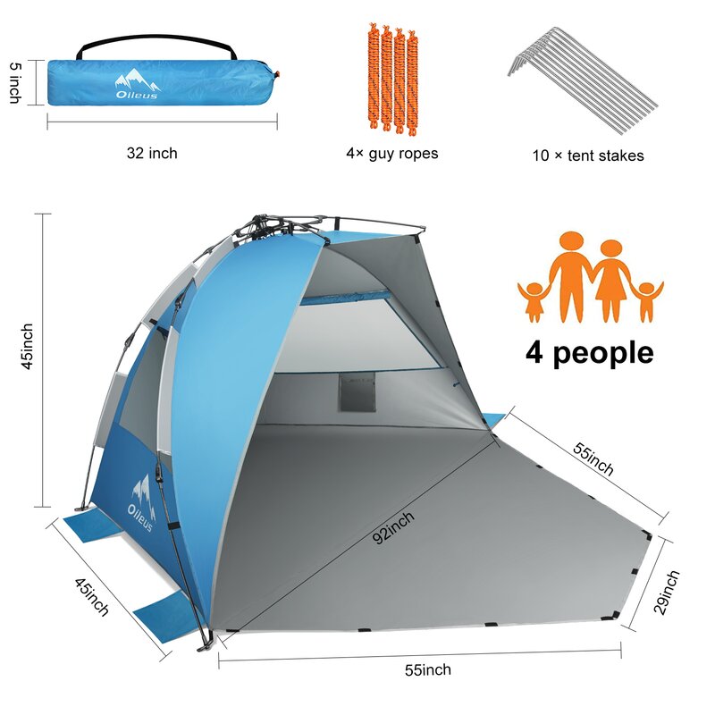 Package Including – 1 beach tent,1 instruction, 1 carry bag with shoulder strap, 6 sand pockets, 8 steel stakes, 4 guylines and 1 storage pouch; Please buy from the Oileus brand, otherwise we will not provide a one-year warranty; if you have any questions, do not hesitate to contact us though Amazon.