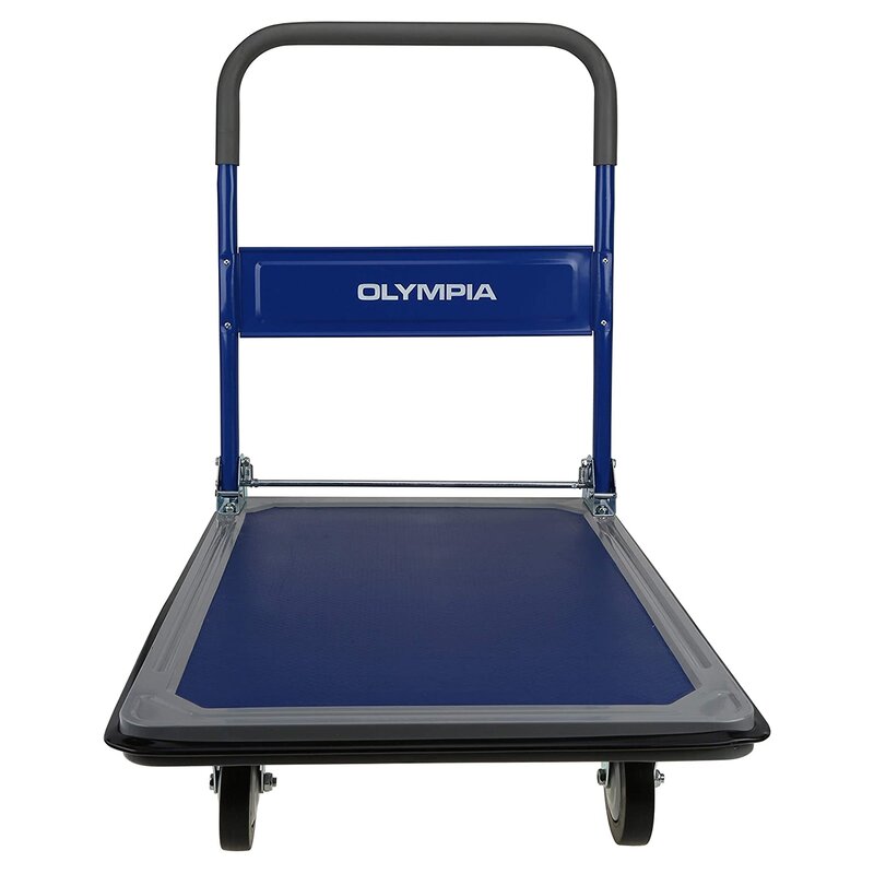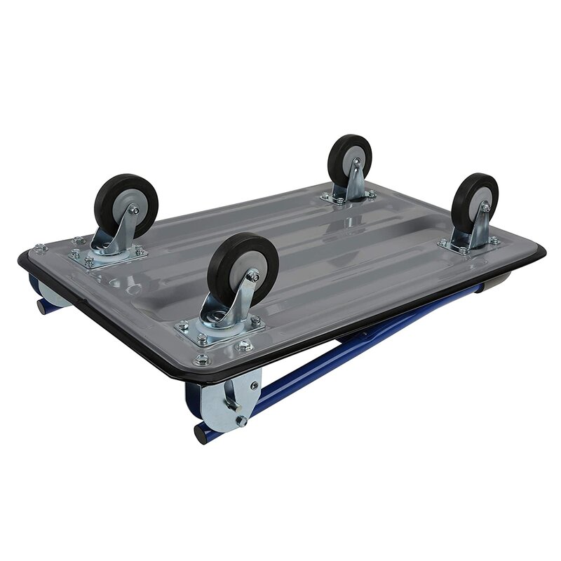 The Olympia tools rolling platform cart is just what you need to easily move items around in your home, shop, office, garage, and more. The rolling cart with wheels incorporates a foldable handle that folds down flat for easy storage, allowing you to save valuable space in your home. The collapsible utility cart features 2 oversized wheels and 2 swivel casters for smooth and effortless maneuvering. The textured, vinyl deck creates a durable surface for hauling whatever items you need to move and keeps them from moving around. Whether you are moving large boxes, potted plants, furniture, or heavy tools, the Olympia tools rolling dolly platform cart will help you get the job done safely and efficiently.