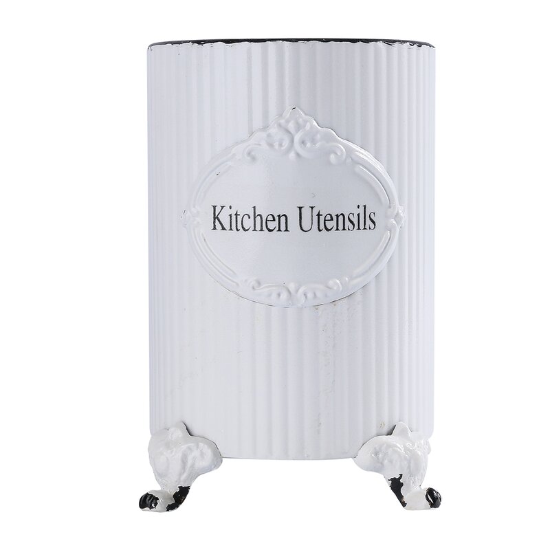 Give your kitchen a fun decor boost with our Ornate White Metal Kitchen Utensil Holder. This vintage-inspired piece features a metal corrugated case design with decorative feet, a distressed finish, and ornate details. Place kitchen utensils inside, so your kitchen storage can fit your incredible style.