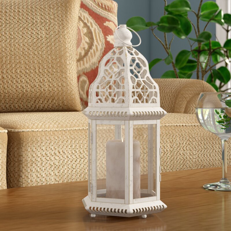A little bit of candlelight will go a long way when you light your favorite candle inside this beauty. The iron frame has a vintage white finish that perfectly showcases the intricate cutout details and flourishes.