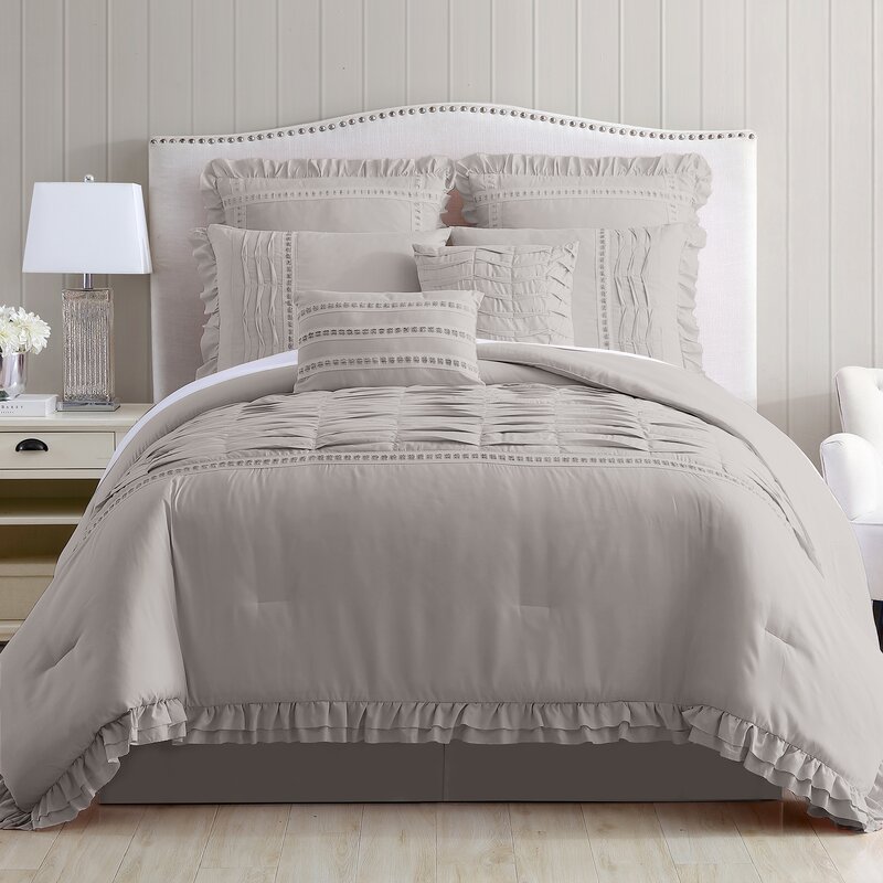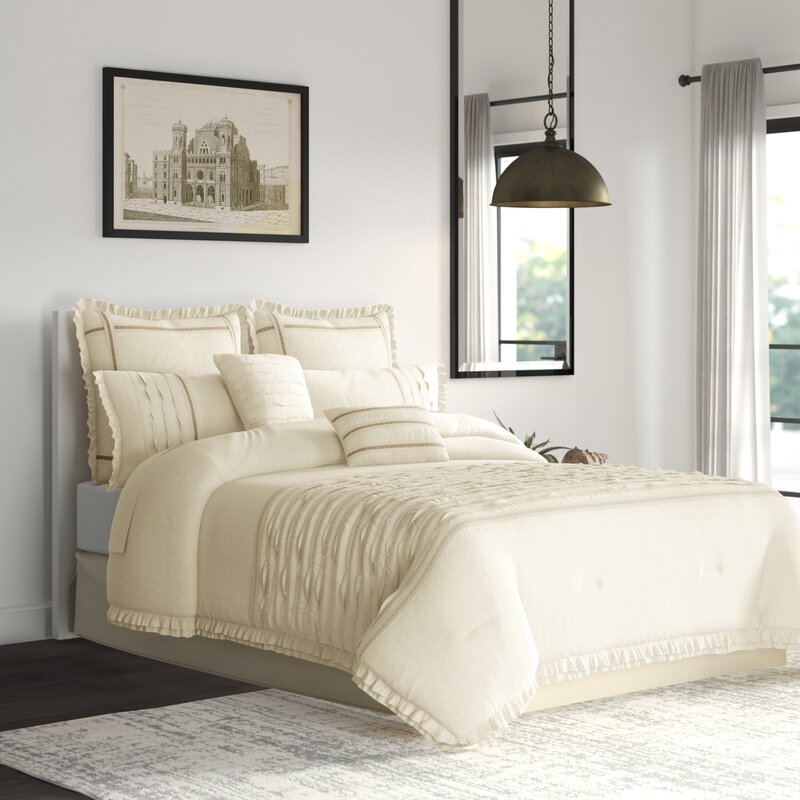 Add a playful pop of pattern to your master suite or guest room with this lovely matching comforter set, showcasing an eye-catching ruffled design, in a solid hue. This set includes one comforter, two shams, a one-bed skirt, two decorative pillows, and two euro shams. It can be easily cleaned, just by machine washing (in a cold gentle cycle) and tumble drying (on low heat).