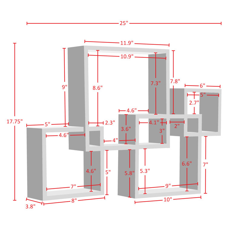 Show off sculptures and snapshots in streamlined style with this wall-mounting intersecting cube shelf! Crafted of manufactured wood in a smooth, painted finish, this unit consists of four intersecting cube shelves in various sizes ranging from 5″ H x 5″ W x 4″ D to 10.75″ H x 10.75″ W x 4″ D. Between each cube’s interior ledge, top surface, and the cubbies made from intersecting squares, there are 14 platforms in all for displaying framed photos, small books, and collected curios.