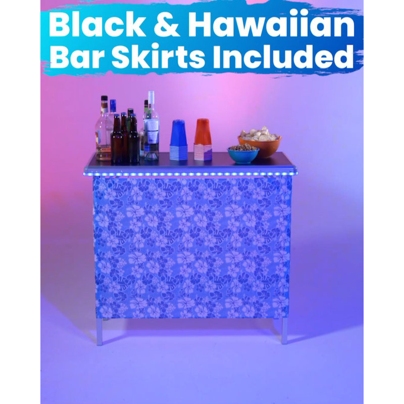 The Portable Bar is a must-have at any party tailgate or event where drinks are to be enjoyed The Bar is super portable lightweight rigid and completely functional The bar sets up quickly with ease The bar shelf easily rests on top of each leg brace creating additional storage space for cups ice garnishes etc It’s best to put heavier items on the ground under the shelf Choose and easily attach the front/side skirt that fits your party atmosphere Attach the black skirt for a formal/neutral event or bring the tropics to your party at any location with the Hawaiian bar skirt The Portable Bar comes with a nylon carrying case with shoulder straps for convenient portability and also keeps your Party Bar protected while in storage. The Color-Changing LED Glow Lights add an awesome lighting effect to your Portable Bar Easily visible in daylight and extra vibrant in the dark these battery-powered LED glow lights put the ‘Party’ in Bar.