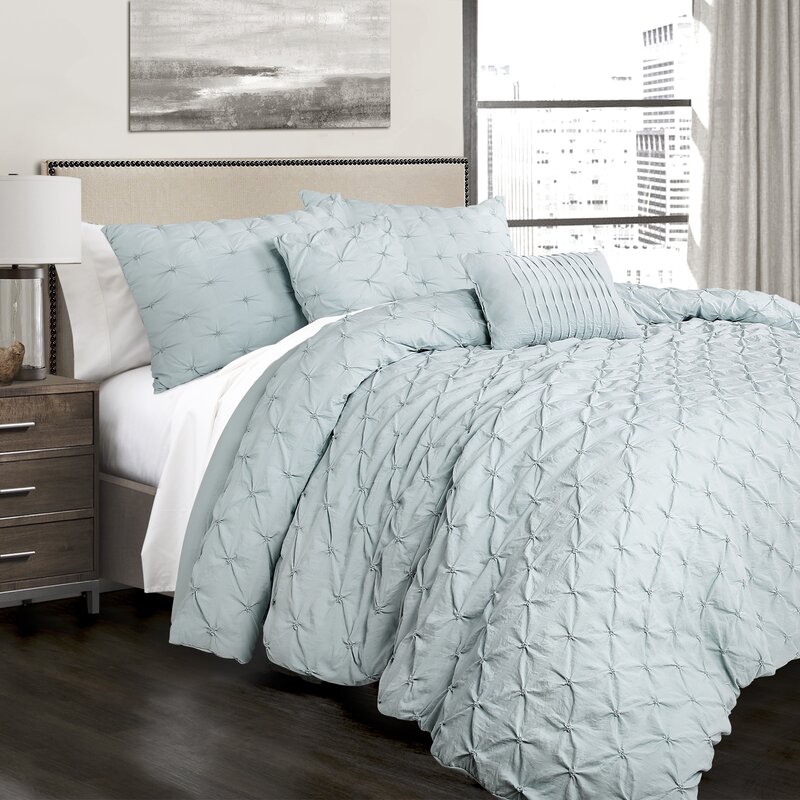 Bring a bit of cozy comfort and textural style to your space with this lovely bedding set, featuring one comforter and four pillow shams with matching crinkled details. Pair this set with a clean-lined, upholstered headboard to contrast its bold look, then set down a beige and gray ikat rug on the hardwood floor below to complement the neutral color palette. Elsewhere around the room, tie a loft-worthy twist into space with metal-framed nightstands and timeworn wood dressers, then arrange matching wood table lamps and a glowing drum-shade chandelier above to add the perfect ambiance to your cozy and on-trend atmosphere.