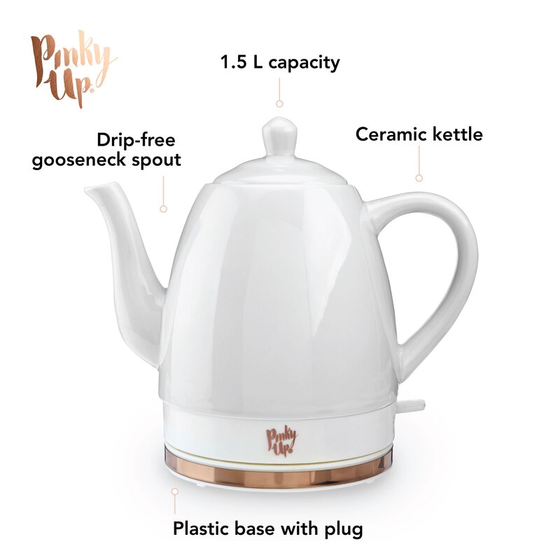 The Noelle Ceramic Electric Tea Kettle features glossy grey ceramic glazing and a trendy rose gold metallic base. With a fully ceramic structure, your water is never contaminated by plastics and other scented materials.