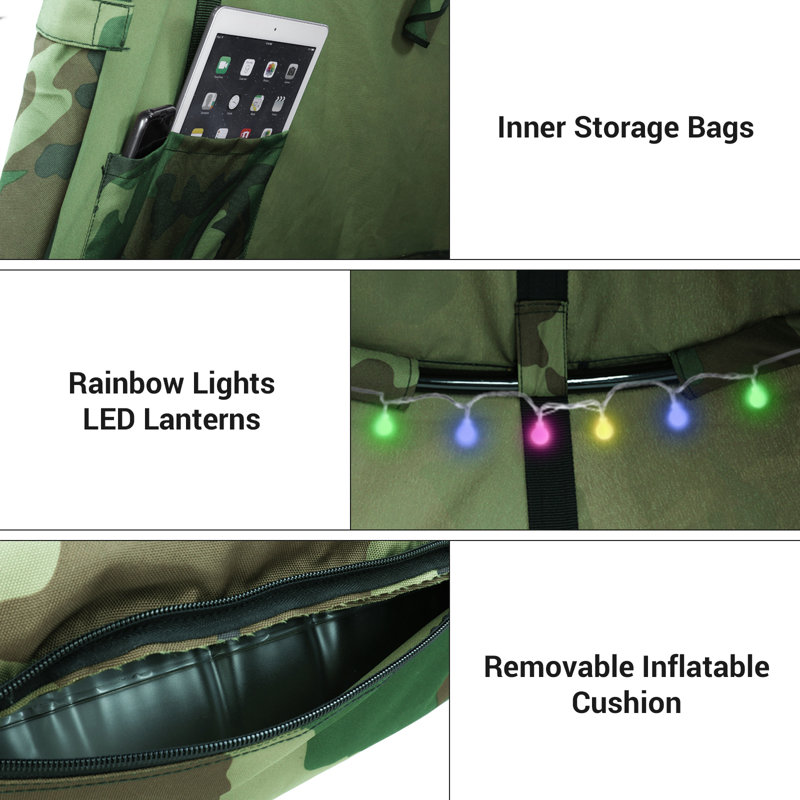 UNIQUE DESIGN & SAFER: Hanging tent has a 2 layer top design, which is more waterproof. Tree tent has a 40″(DIA)*4.7″(THK) inflatable cushion, which will make your child more comfortable and safe. Tent has rolling door and window to facilitate ventilation and block entry of small animal. Pocket design is convenient for storing small item. Base steel pipe is covered with foam, which can prevent children from accidental collision and protect children’s safety when playing.