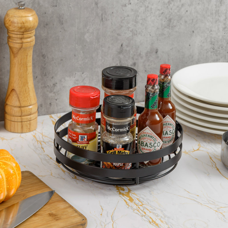 Bring contemporary style to any bedroom, bathroom, or kitchen with this open wire design black metal, turntable tray.