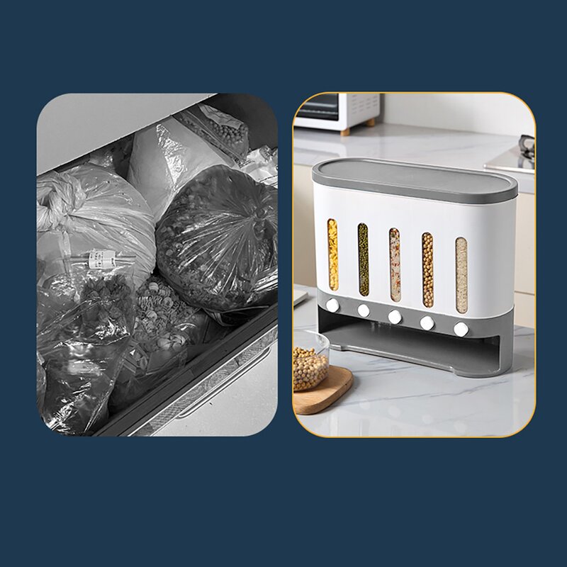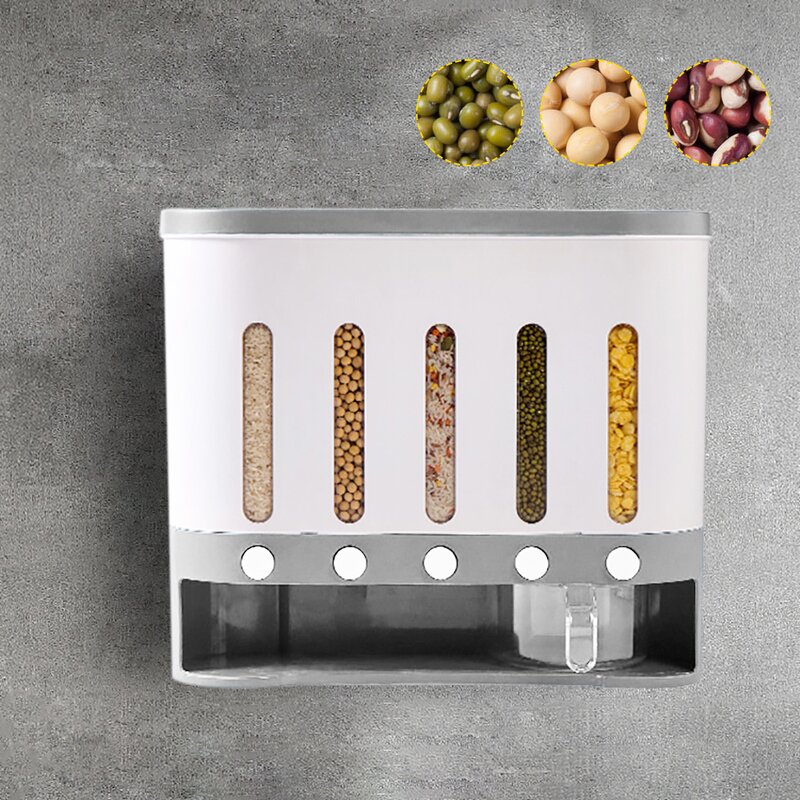 Storage container is transparent visual design of the storage dispenser, easy to check the remaining amount at any time. And it is more convenient to take the grain out by pressing the button and put the grain into the tank from the top of the box. Large capacity can hold all kinds of dry food. Make your kitchen clean and tidy. The large compartments on both sides can hold 2.1kg of grains, and the middle three small compartments can hold 1.6kg of grains each.