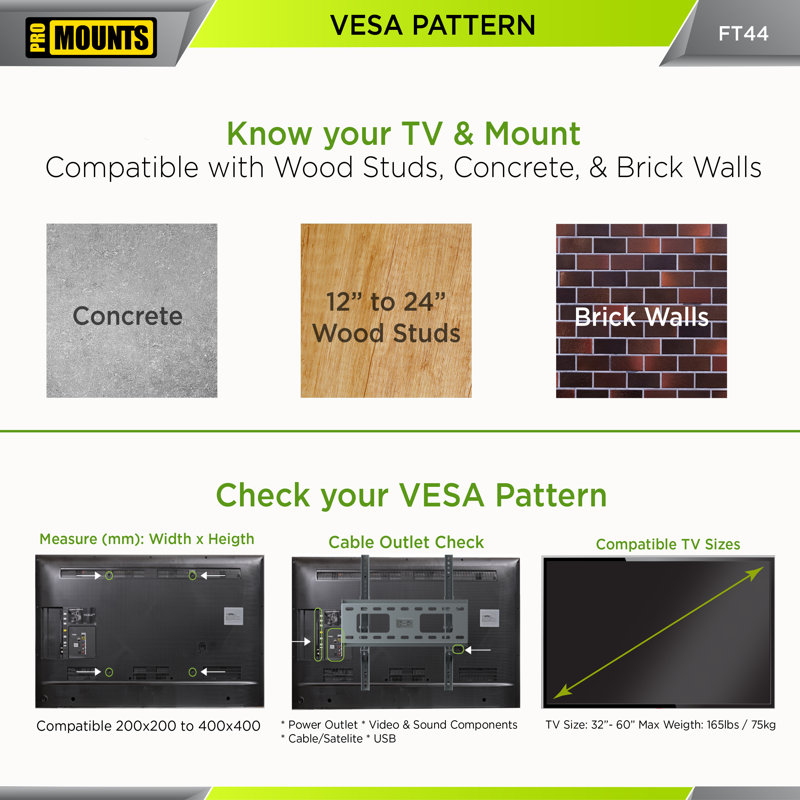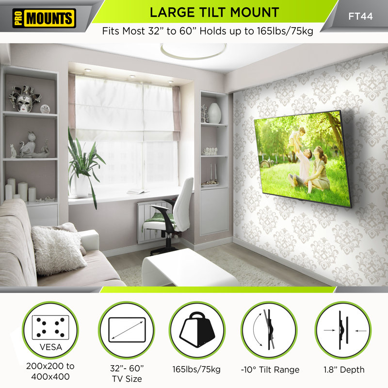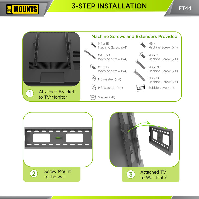 Built with quality in mind, the FT44 is a tilt TV wall mount that supports most 32â€-60†TVs weighing up to 165 lbs. The unique design of the FT44’s universal mounting brackets means that display compatibility is almost guaranteed. For precise compatibility, simply check your display’s VESA hole pattern against the VESA range listed here. If your TV’s VESA pattern matches or falls within the range shown, then your TV is compatible. It’s that easy. Made for a modern lifestyle, the FT44 has built-in features that help you get the most out of your display. A fully assembled, open-back wall plate allows for easy cable threading and management, keeping cords out of the way and out of view. This function also ensures that your cables will remain in pristine condition, which will keep picture quality sharp and will provide a pleasurable viewing experience. An audible locking system and quick-release pull tabs offer a way to easily install, adjust, or remove your display from the wall plate without hassle. Depending on your wall type, the FT44 also gives you the option to shift your TV for perfect placement, even with off-center studs (consult your installation/user manual for more information.) The FT44 is sleek, stylish, and slim in design. A high-quality black matte finish gives a modern look and its slim depth places your display just 1.8†from the wall, making your TV the focal point of the room while hiding the hardware. The FT44 tilt mount is best utilized in areas with a set viewing area, where multiple angles are needed, or in a set viewing area with a high mounting point. A tilt mount allows the user to position the display for the best viewing angle gently. Our unique TouchTilt technology provides you with toolless adjustment for angles up to 10°, affording the perfect view. If your space has a fixed viewing area or multiple viewing areas, we recommend a flat or articulating mount instead. A smooth and seamless installation process is what we strive for and all our mounts are stress and pressure tested with four times their recommended weight limits. This, coupled with quality materials, guarantees that they will not bend or snap under pressure, ensuring your display’s security. Included in the box is an easy-to-understand manual, complete with demonstrative images that show you the exact steps needed to achieve your perfect viewing experience. For convenience, we have also included multiple screw sizes to ensure compatibility with a wide range of display types.