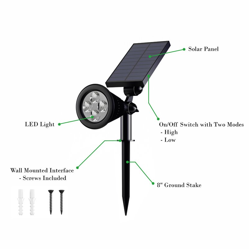 The solar powered led spot light pack is the perfect addition to your outdoor home decor! Equipped with a solar-powered rechargeable battery, these lights come in a convenient set of 2 and are energy-efficient, eco-friendly, and practical. The bright led spotlights are a great lighting option for your garden, porch or patio! The included ground stakes and wall mount screws make it easy to secure the lights in your backyard, flowerbeds, around the pool, or alongside your driveway or pathways. This set is a great option for illuminating any outside space!