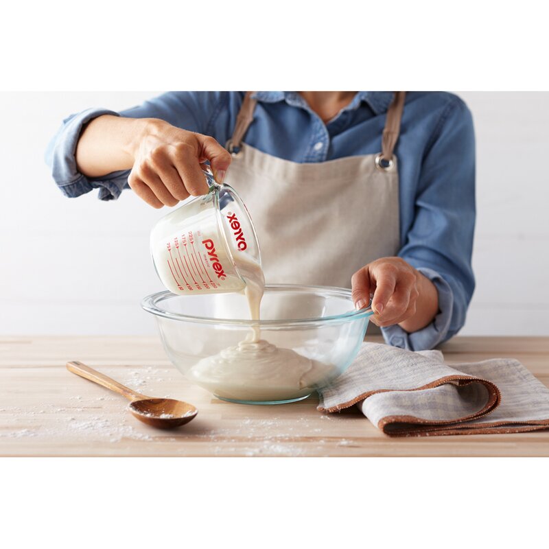 Use the Pyrex Prepware Glass Mixing Bowl for mixing batter or cooking in the microwave. This mixing bowl sports a clear color for an attractive look and also allows you to easily keep an eye on your food. It is sturdy and durable. This bowl can be hand washed as and when required.