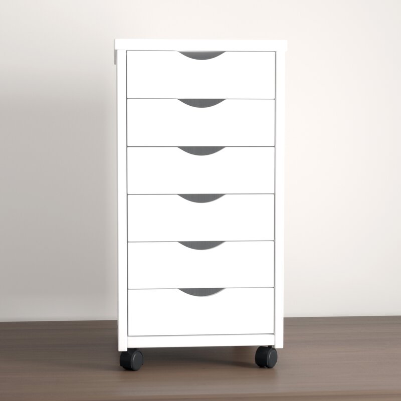 The home office can quickly become one of the most cluttered places in your abode if you let it. Get your organization on with this filing cabinet! Crafted from solid pinewood, this piece is perched atop caster wheels for easy mobility when you want to create space. Six drawers are ideal for tucking away any letter-size documents, and after assembly, fitting easily into cramped corners and narrow nooks.