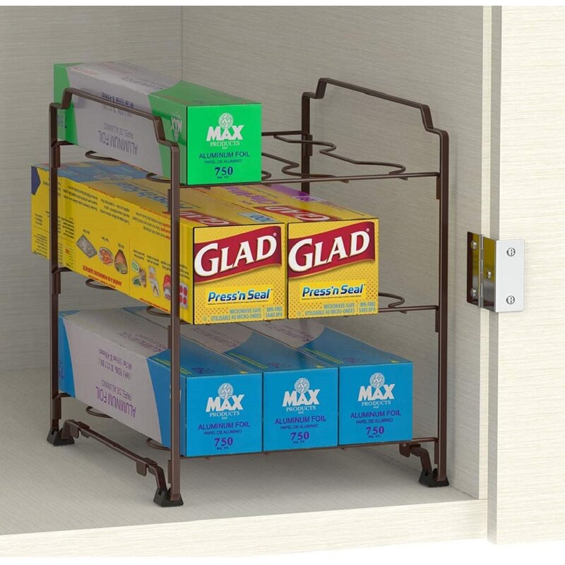 This organizer rack will keep your kitchen clean and organized. Keep all of your tin foil, non-stick foil, long foil, baggies of every size, wax paper, parchment paper, etc. organized and easily accessible in your pantry. This shelf organizer is constructed from high-quality metal with chrome plating. This metal is specifically made with rust-resistant components and is sturdy and durable. The high-quality metal does not interfere with or harm your countertops, table, or kitchen because of the anti-scratch and rounded legs.