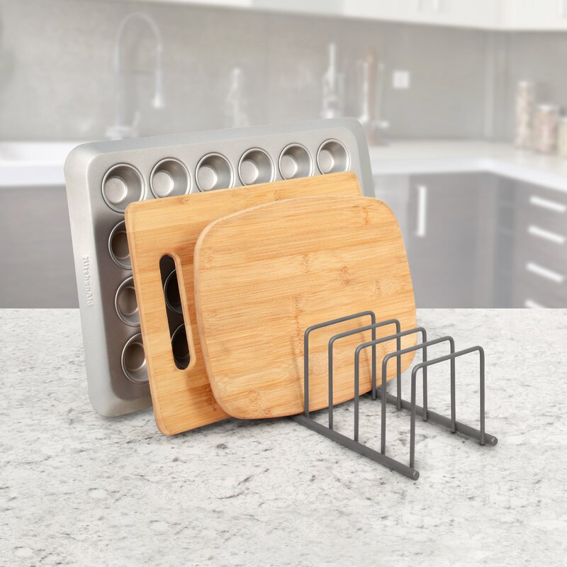 Clear up precious cupboard space with this Callen Kitchenware Divider. Eight dividers neatly organize your cookware lids, plastic containers, plates, baking sheets, or office files and folders. This clean design will add a modern touch to your home.