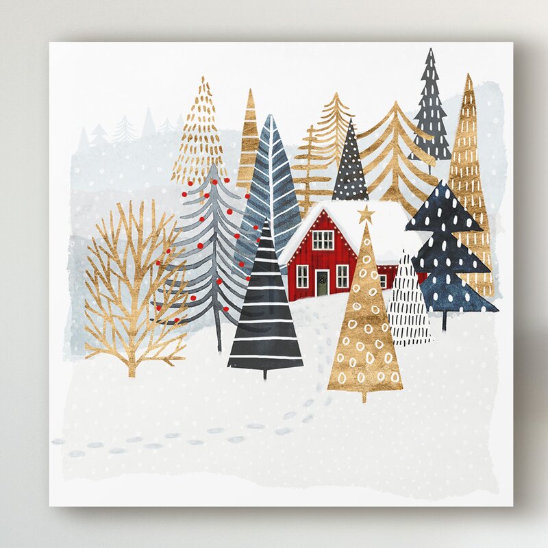 This charming reproduction painting on canvas infuses your living room, bedroom, or home office with seasonal spirit. Entitled “Christmas Chalet I†by artist Victoria Borges, this square acrylic painting is printed on wrapped canvas. It features a snowy landscape with a house surrounded by trees, with a trail of footprints leading to its door, all rendered in shades of gray, blue, black, and red. We love that this piece comes with its own wall-mounting hardware, so it’s ready to hang over your sofa, bed, or desk.