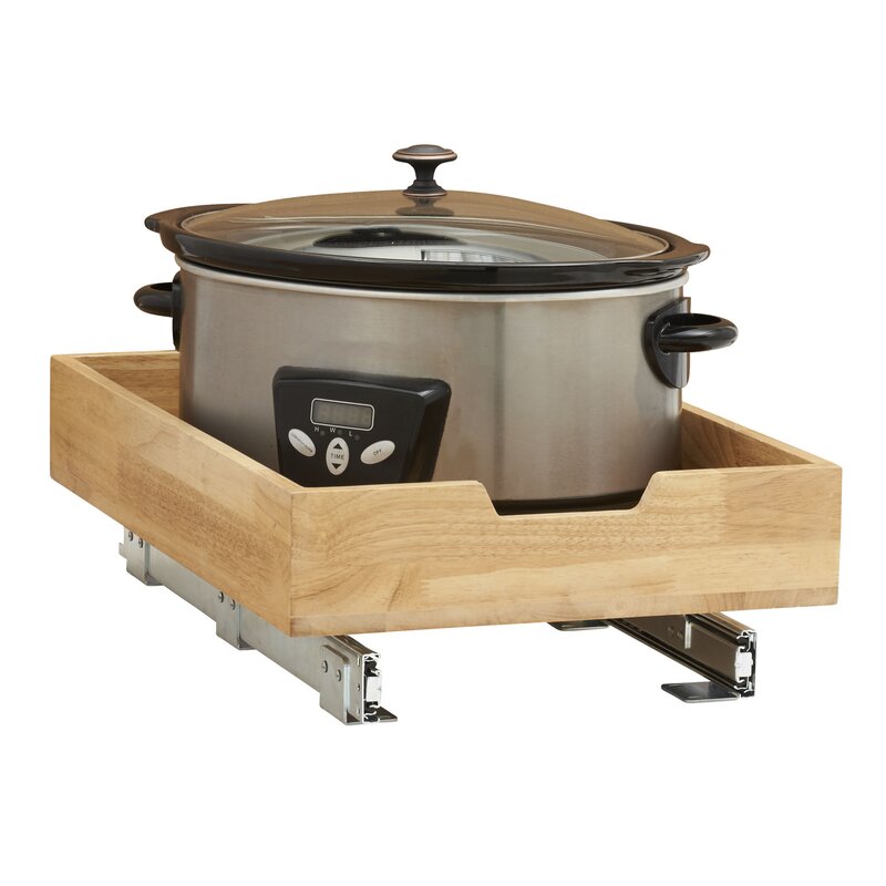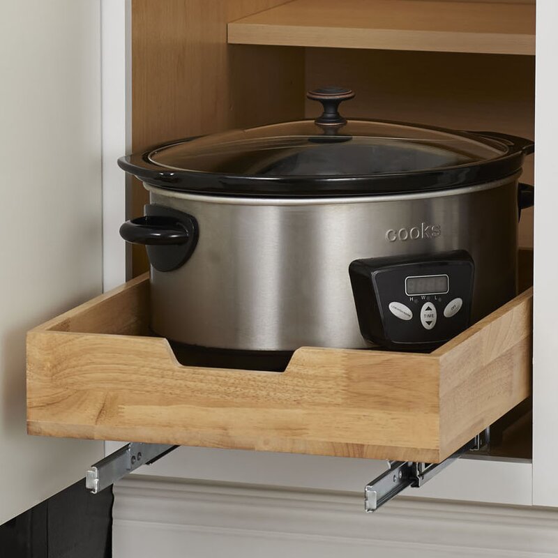 Have a hard time spotting cleaning supplies tucked in the back of your bathroom vanity? Need a hand to reach the baking soda in your kitchen cabinet? Make it easier to get a hold of the essentials with this pull-out drawer, a brown-finished basket that includes hardware so you can easily install it to the bottom of cabinets. Its chrome-finished steel glides fully extend to let you make the most of your storage space and effortlessly access smaller items stowed in the back, while its solid wood basket supports up to 88 lbs.