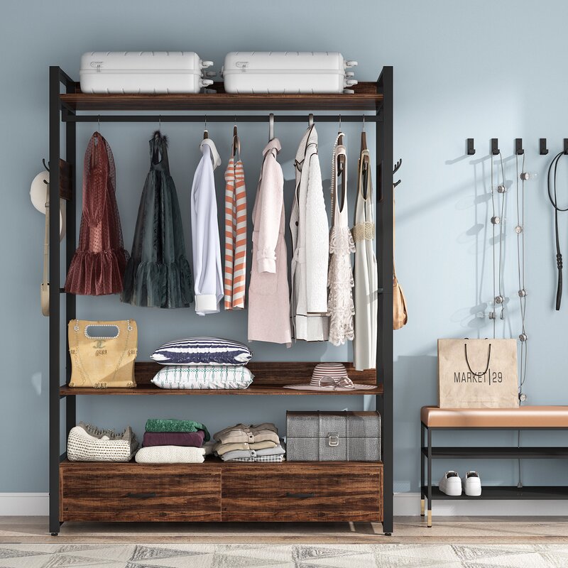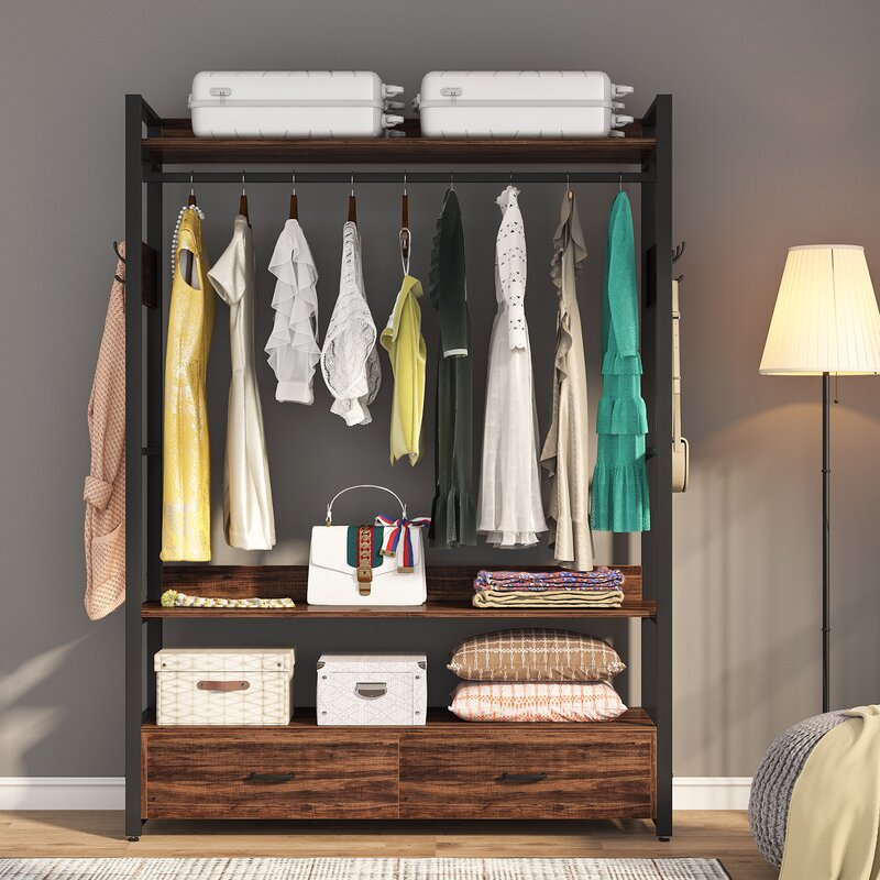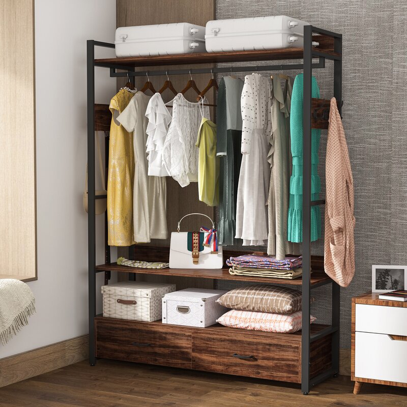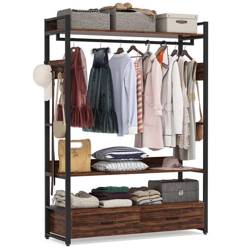 Freestanding clothes rack shelves, closet organizer with shelves drawers and hooks, heavy-duty garment clothing wardrobe storage shelving with hanging rod.