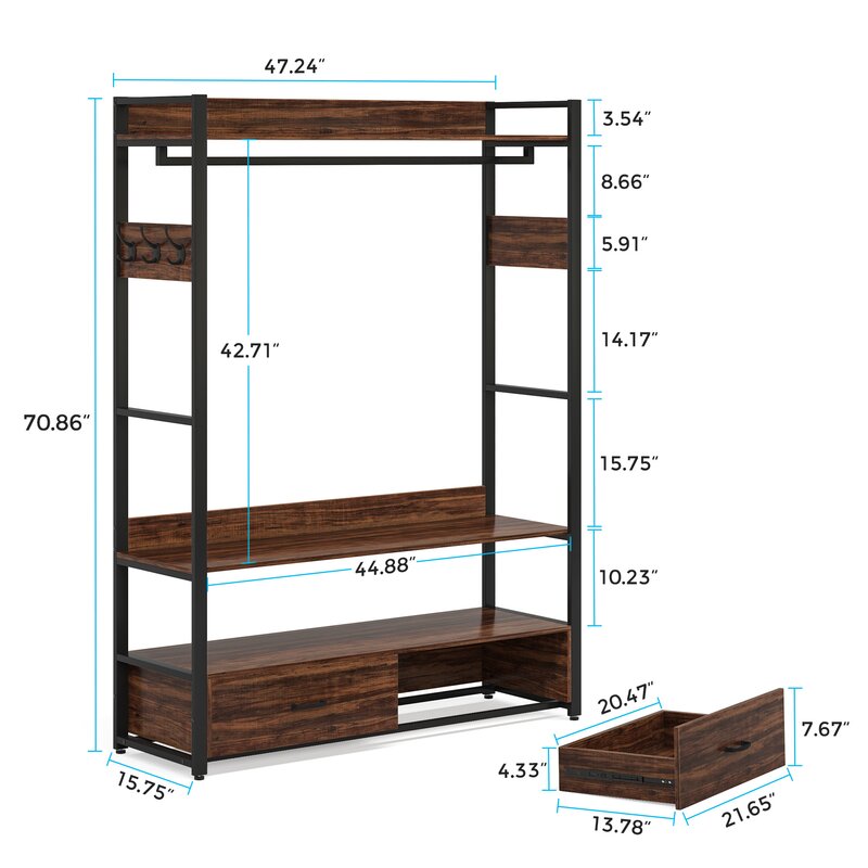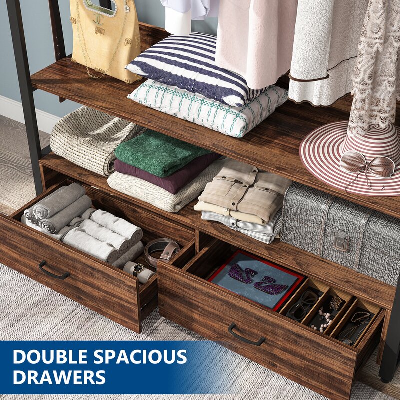 2 Large shelves ensure you plenty of room to store clothes, shoes, etc. Double drawers are perfect for your underclothes. For hanging your dress and long coat. And put large heavy boxes on the top for added storage. Features 3 hooks on each side super convenient for your accessories.