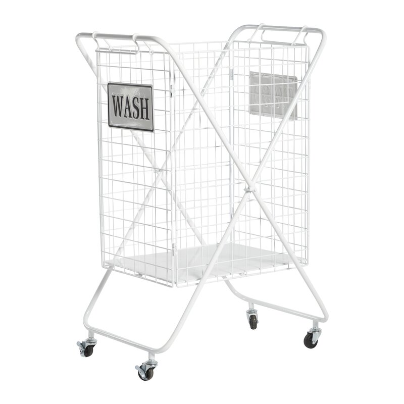 Large white metal laundry basket with smooth wheels and “WASH†sign