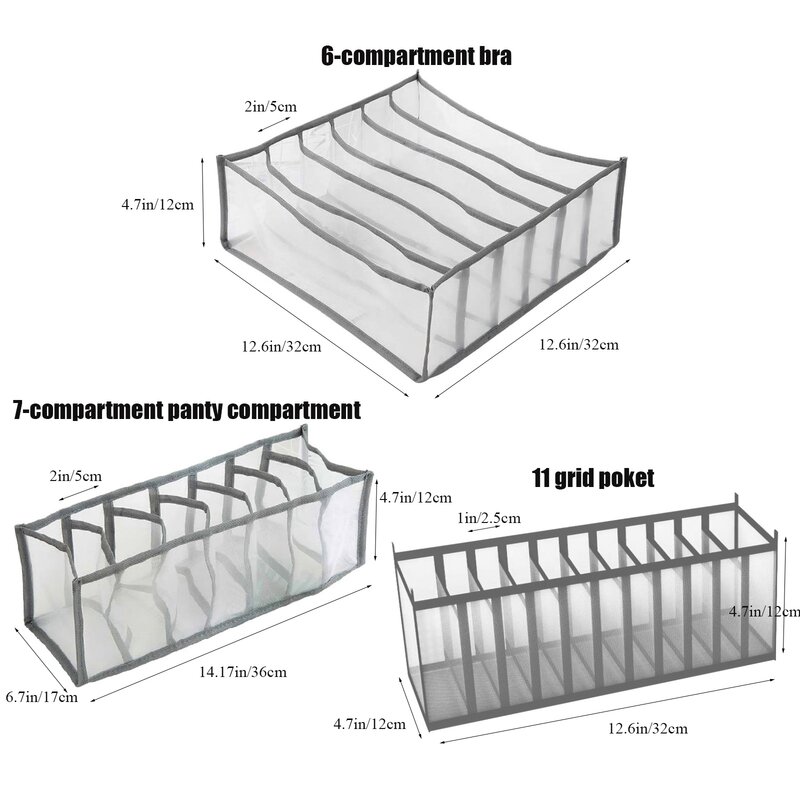 The 6-compartment drawer storage box is perfect for organizing bras or leggings, the 7-compartment drawer storage box is suitable for panties or camisole or winter thick socks, and the 11-compartment drawer storage box is suitable for socks, belts, ties, or headbands. Suitable for underwear, bras, socks.