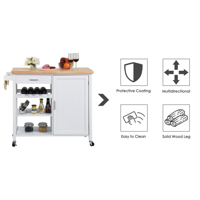 How to keep the kitchen tidy and organized? This must-have kitchen island is the perfect addition to your home. The water-resistant top is made of oak wood, which has sturdy construction and long service life. with an upper drawer, open shelves, and an enclosed cabinet, it offers plenty of space for wine bottles, canned food, and other kitchen necessities. The kitchen island sits on 4 strong universal wheels (2 with brakes), that provide versatile use when and where you need it. Simply design with an elegant appearance to be widely used on many occasions. This kitchen island is your good assistant during mealtime or teatime with family and friends.