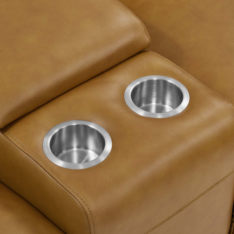This leather match recliner theater set is just the right fit for your family and friends. Featuring two power recliner seats and one console with cup holders & storage, this functional theater set allows you to tailor your living room or den to your liking. The power recline seat and adjustable headrest provide you with maximum relaxation.