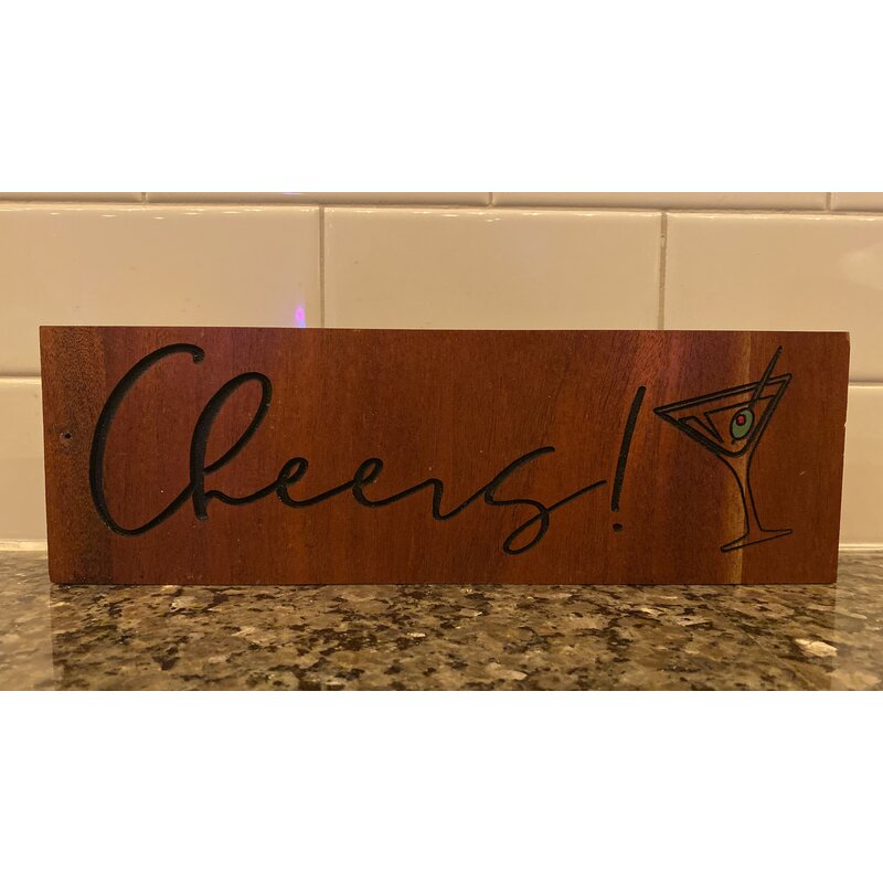 A standing sign carved with a martini glass and Cheers! In Script. Choose from white or black lettering, with or without glitter. Sign measures approximately 11.5″ L x 3.75″ tall.