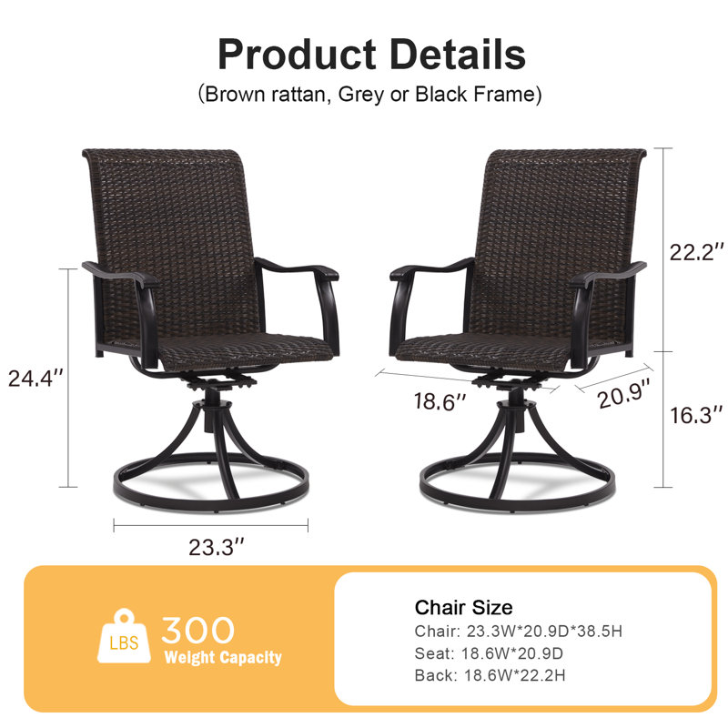 ã€Large Size】Chair Size: 21.7″W x 21″D x 38.5″H, seat height: 13.8″ . Wight Capacity: 350LBS. Extra larger than most outdoor rattan chairs on market.