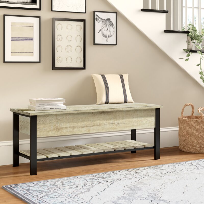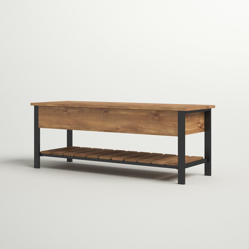 This bench is both beautiful and functional, providing ample storage and a touch of modern farmhouse style for your home’s entryway or hallway. The natural-looking wood finish made of warp-resistant MDF and powder coated metal give it a unique rustic design that’s sure to complement a variety of home décor. The open top storage space as well as the bottom slatted shelf are the perfect place for your shoes and accessories that you’ll need when you’re headed out the door.