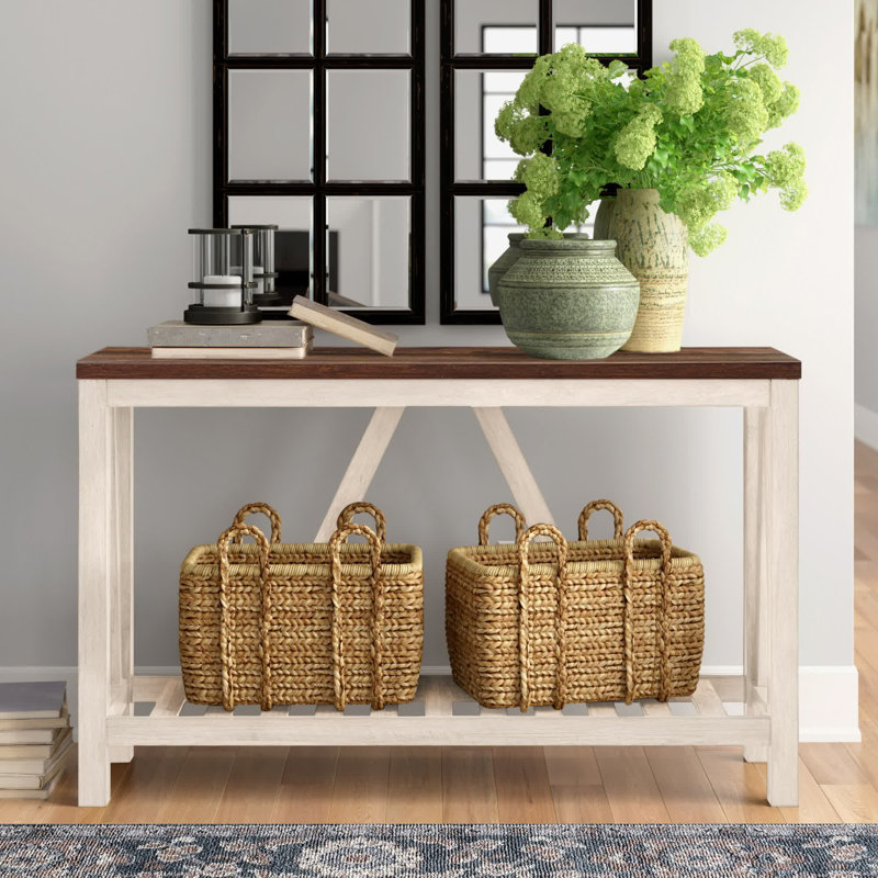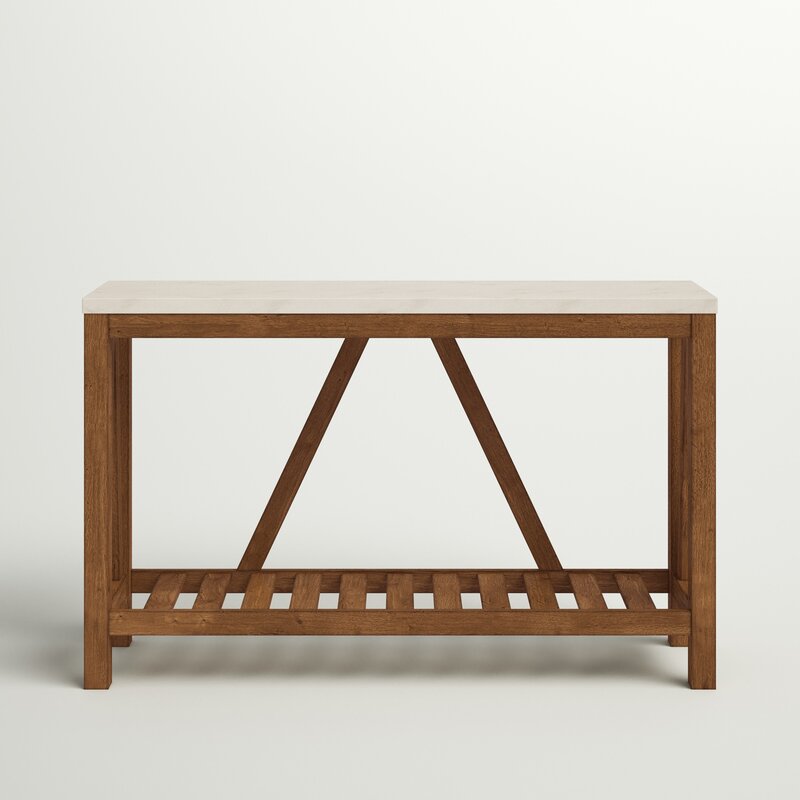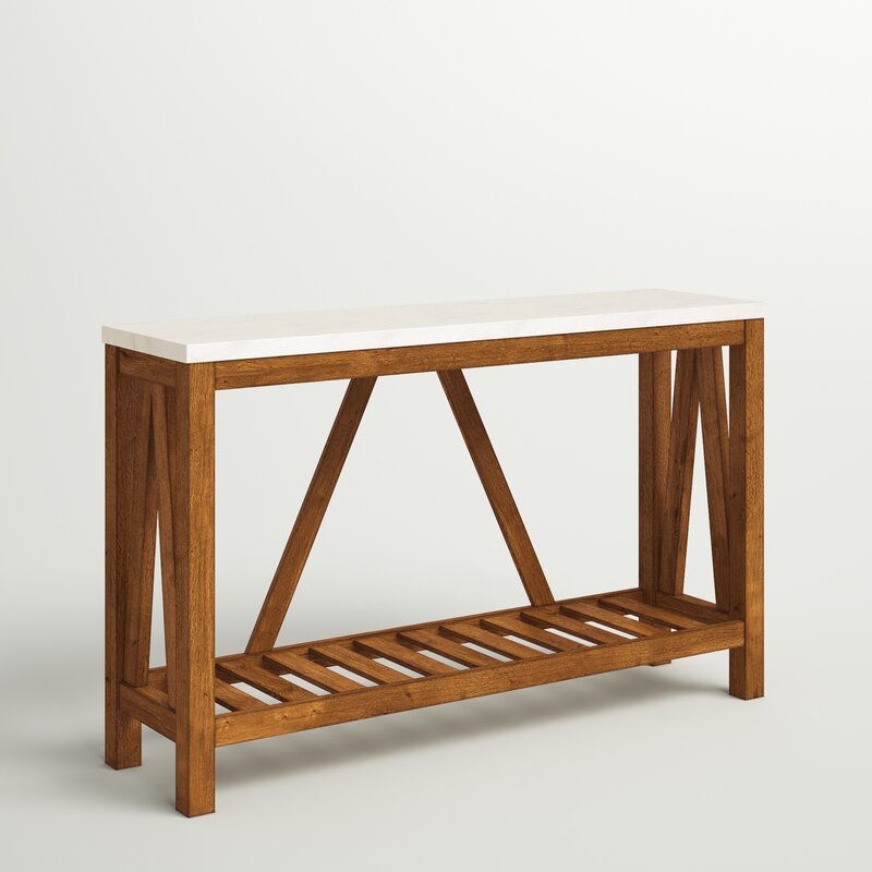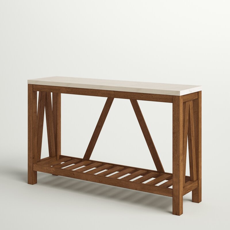 Define a space to display framed photos, potted plants, a collection of keys, and other entryway essentials with this clean-lined console table. Crafted from manufactured wood with laminate, this piece features a rectangular top and slatted lower shelf for open storage space. A-frame accents on the back and sides give this design an updated feel, while a neutral finish helps it blend with a variety of color palettes and aesthetics.