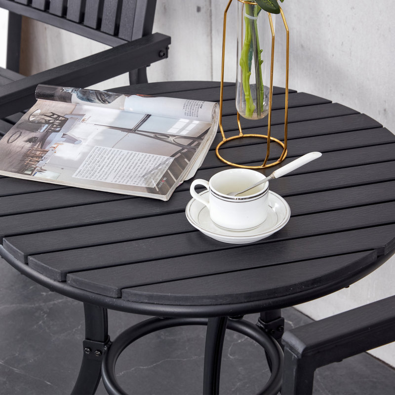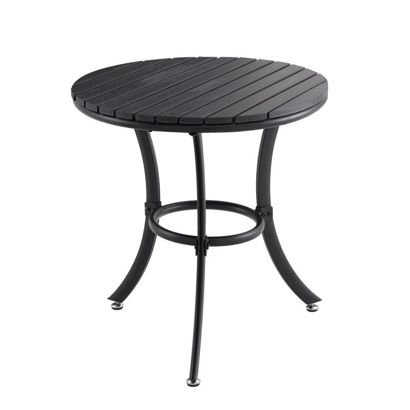 This round patio table is made of a sturdy metal frame and plastic wood board can bear all weather elements. Simple lines as well as square contours creates this modern patio dining table.