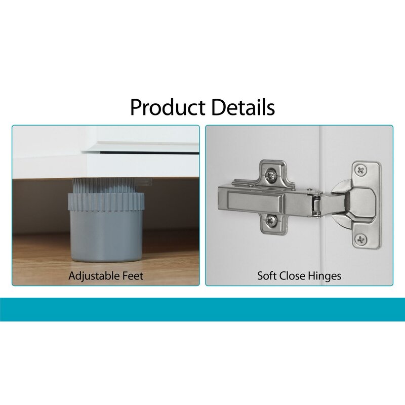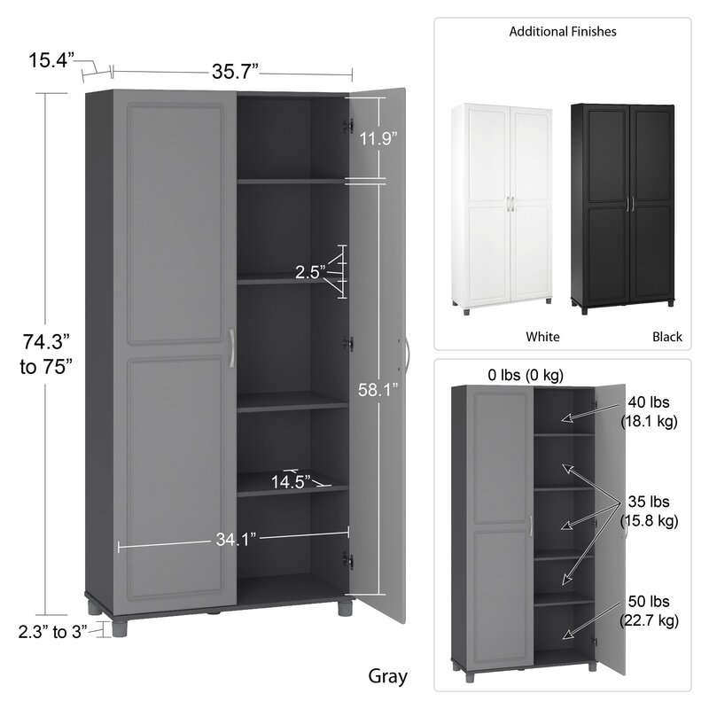 The 5 shelves, 3 adjustable, can store and organize your cleaning supplies and even kitchen pantry items. Soft closing hinges prevent slamming doors. Adjustable feet keep your Cabinet level on uneven floors