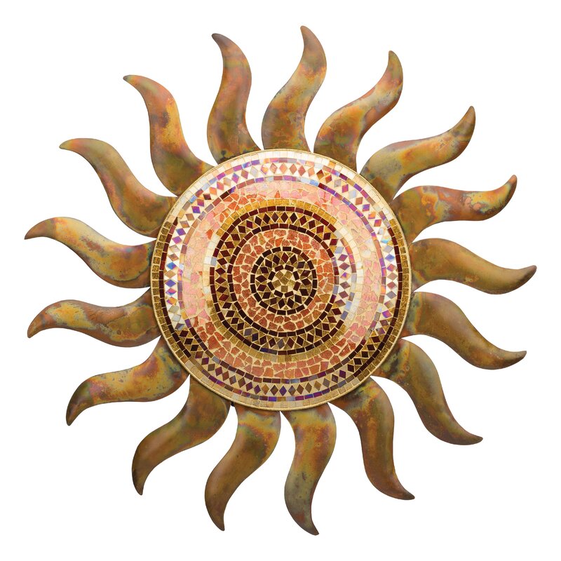 Mosaic glass and stylized metallic rays are combined to make this dramatic new Wall Decor. The domed, concentric patterned center adds sophisticated geometry that also glimmers from all angles. Intricate hand-painted mosaic glass is treated with a clear lacquer, while the metallic rays are powder-coated to make it weather-resistant for indoor or outdoor use.