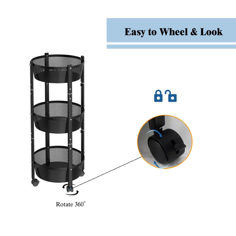 Are you still troubled by not knowing how to choose the right cart? Come and see our new 3-tier foldable cart. The cart consists of four steel pipe stands spray-painted with steel powder coating and three round storage mesh baskets. It also has four plastic movable casters, two of which have locks. Such a unique humanized design makes the cart extremely lightweight, allowing you to move it wherever you want without any effort, and the two caster locks can keep the cart in place without sliding away. You can put it in the bathroom for toiletries, and paper towels; also can be used in the kitchen to store seasonings or food or be placed in the living room for snacks and drinks, and anything else you can think of. It is definitely the best choice for your home storage.