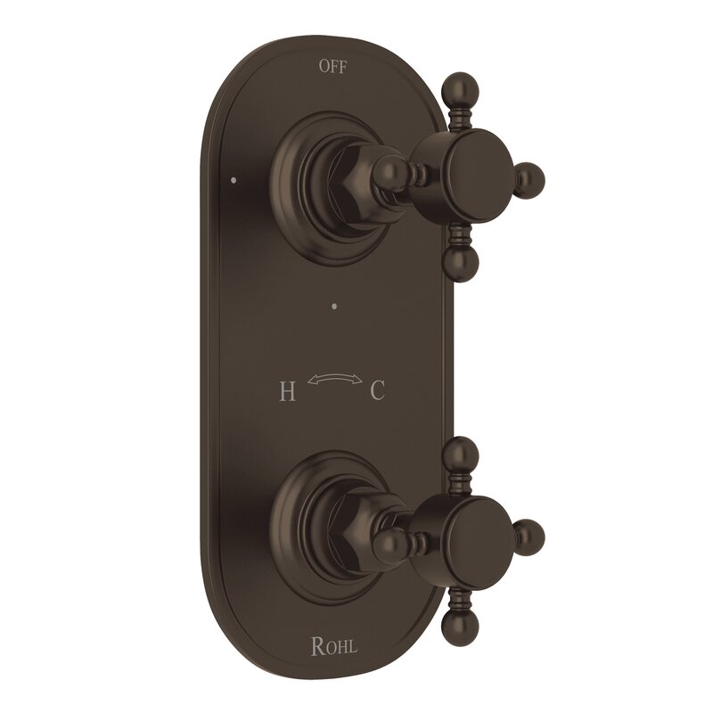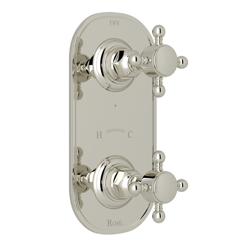 When used with rough-in valve R1051BV with 6.7 GPM (sold separately), the top handle controls on/off and volume while the bottom handle sets the temperature