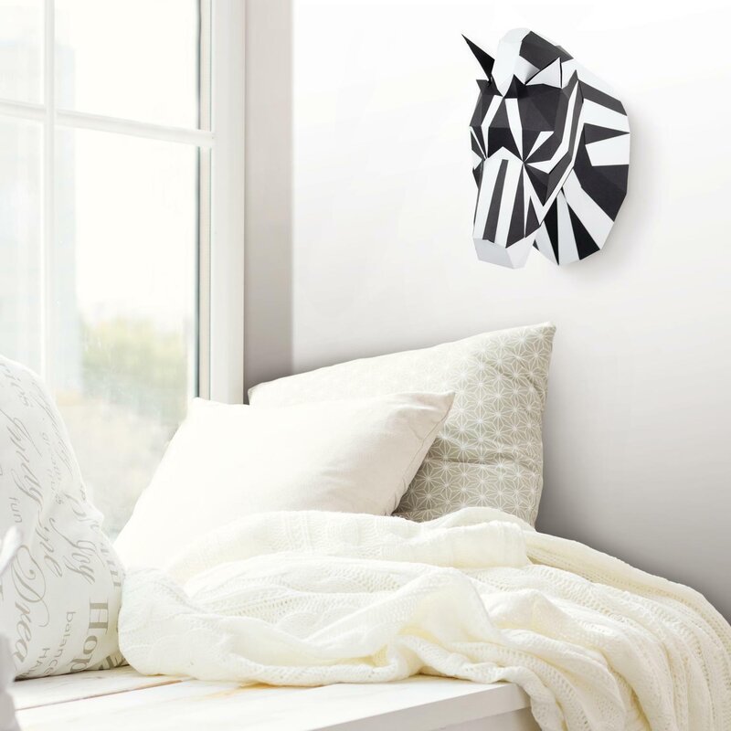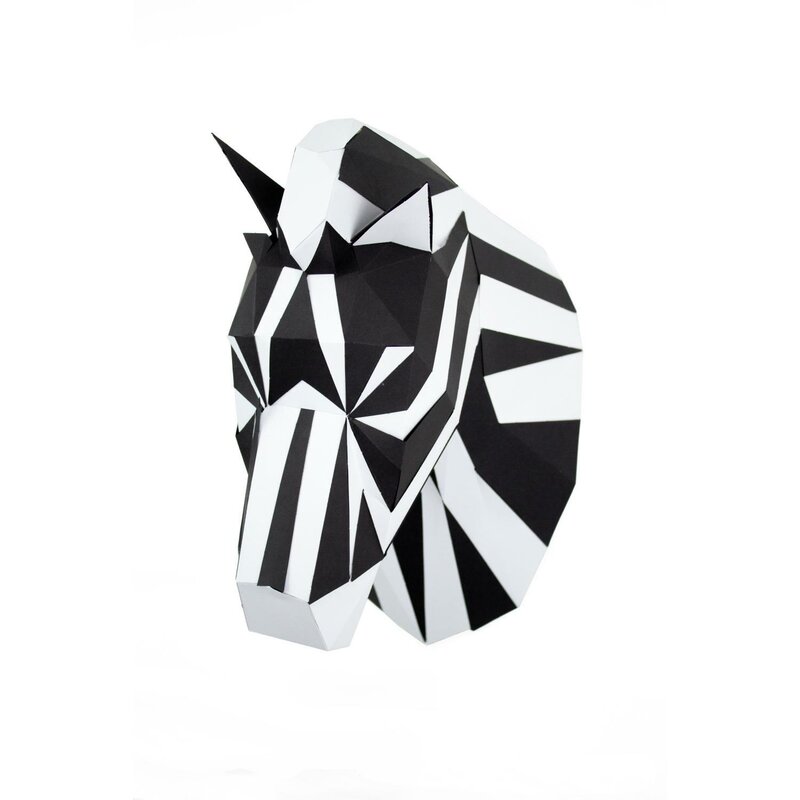 Modern-day origami includes pre-cut paper parts and double-sided tape to create a 3D paper animal head trophy, simply fold along dotted lines and use tape to stick together