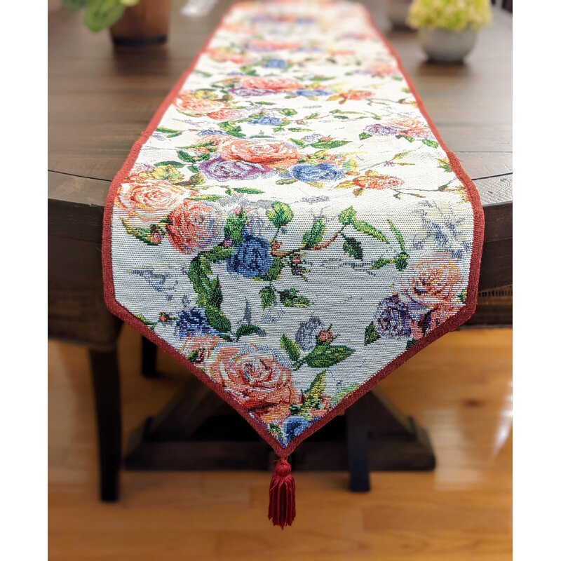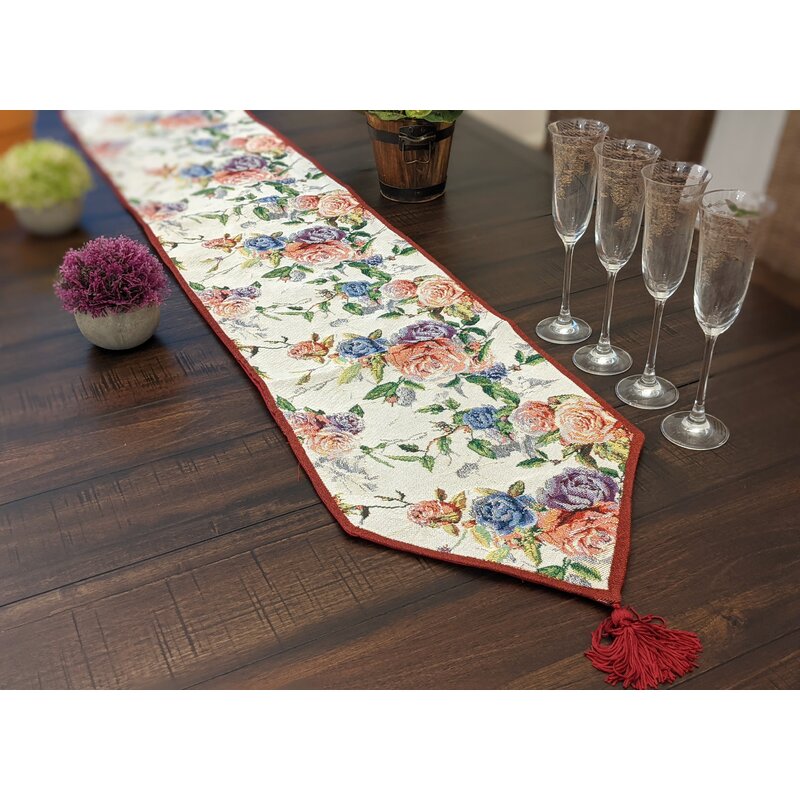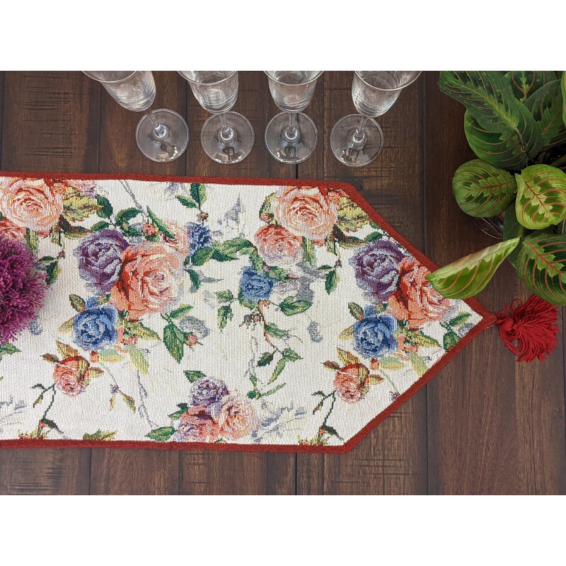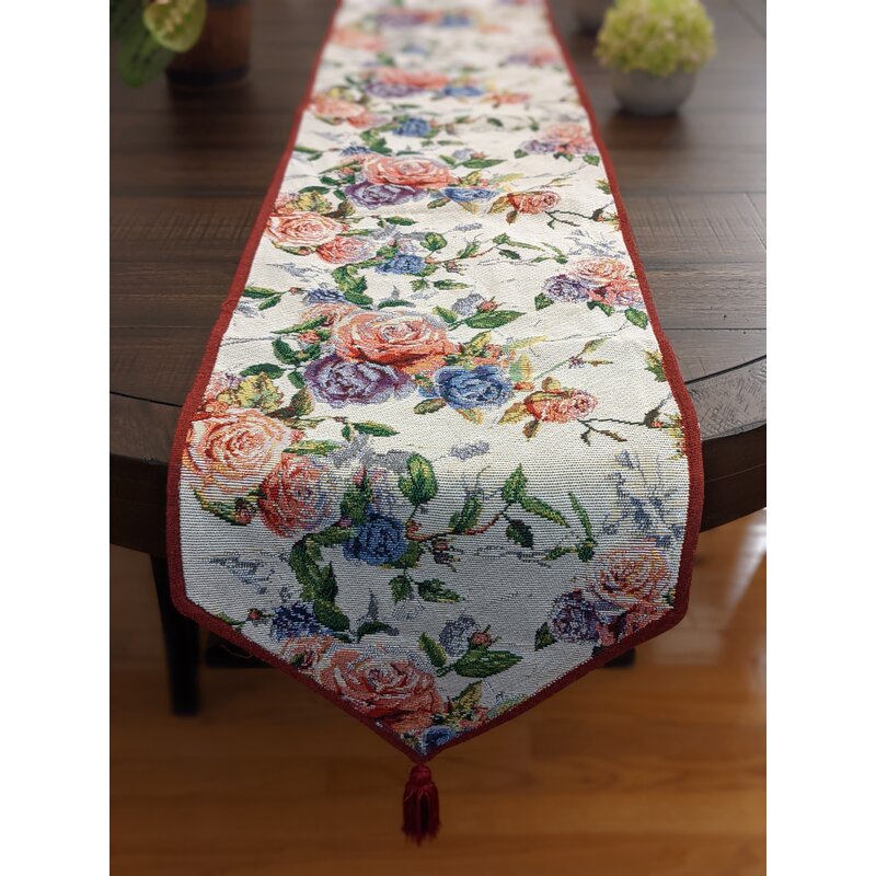 Enchanting and Vibrant with hints of pink, blue, purple and green rose patterns on our lightweight, durable and woven cotton linen table runners. Table runner comes with a decorative burgundy red tassel on each end giving it an elegant touch + Backside of table runner is a romantic red shade