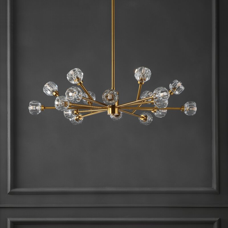 This chandelier is gorgeous! I love the quality of this light, it is very well built. The crystals are so pretty and cast off the most beautiful light. I like the solid brushed gold down rod that is adjustable to desired height.
