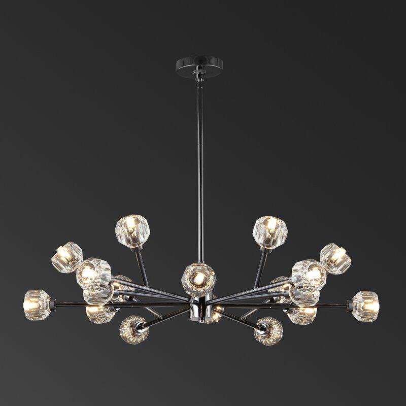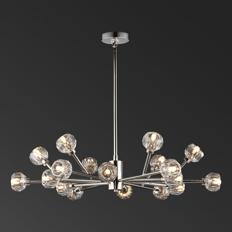 This is gorgeous in my kitchen over my 60” round table! The bulbs were too yellow for me do i switched them for white and it’s perfect! I have it hanging at the longest drop length of 45”. It’s the only chandelier in this style that could be used at a slant and gave down rods that length. Most only hung up to 20”. I love it!