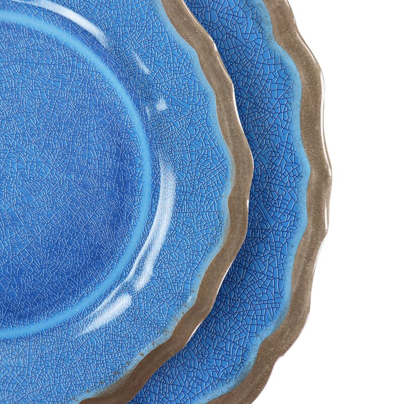 Beautify the dining table for your big night with the Roma 12 Piece Melamine Dinnerware Set by Rosecliff Heights. This set comes with service for four, including four bowls, four dessert plates, and four dinner plates. Constructed with lightweight durable melamine, this set is perfect for use indoor and outdoor and will stand the test of time. Designed with a crackle-painted glossy coating and a scalloped edge, these dishes will add some color and interest to any table. Top-rack dishwasher is safe for easy cleaning.