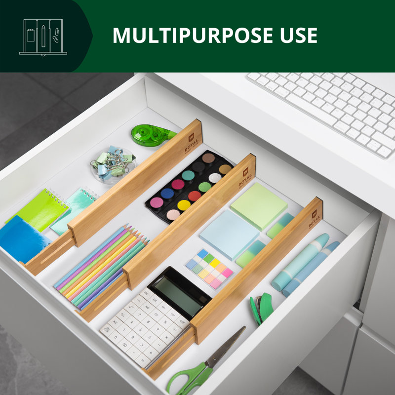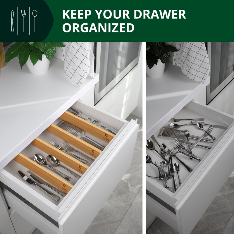Royal Craft Wood bamboo drawer dividers fit perfectly in every drawer. You can adjust the sizes of the organizers as needed without any problem because the wood kitchen drawer dividers from Royal Craft Wood are extendable and adjustable.