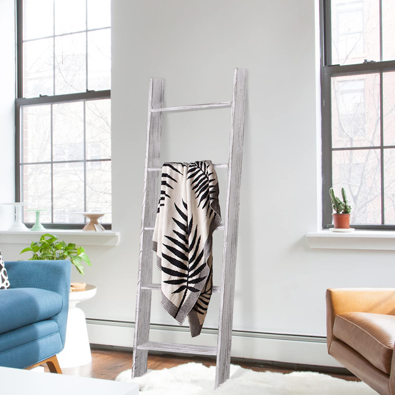 This blanket ladder brings a rustic, cozy touch to your bedroom or living room decor. It’s crafted from solid pine wood with a weathered brown finish for the right blend of coastal and farmhouse style in your space. This piece features a classic ladder silhouette with five bars for displaying your blanket collection, scarves, and beach towels. We love how this ladder looks leaning next to your sofa or your favorite reading chair. It measures 54” high and 18” wide, and it weighs a little over 7 lbs. for a lightweight design.
