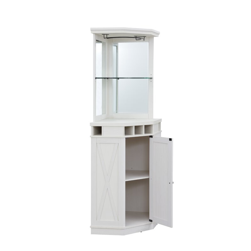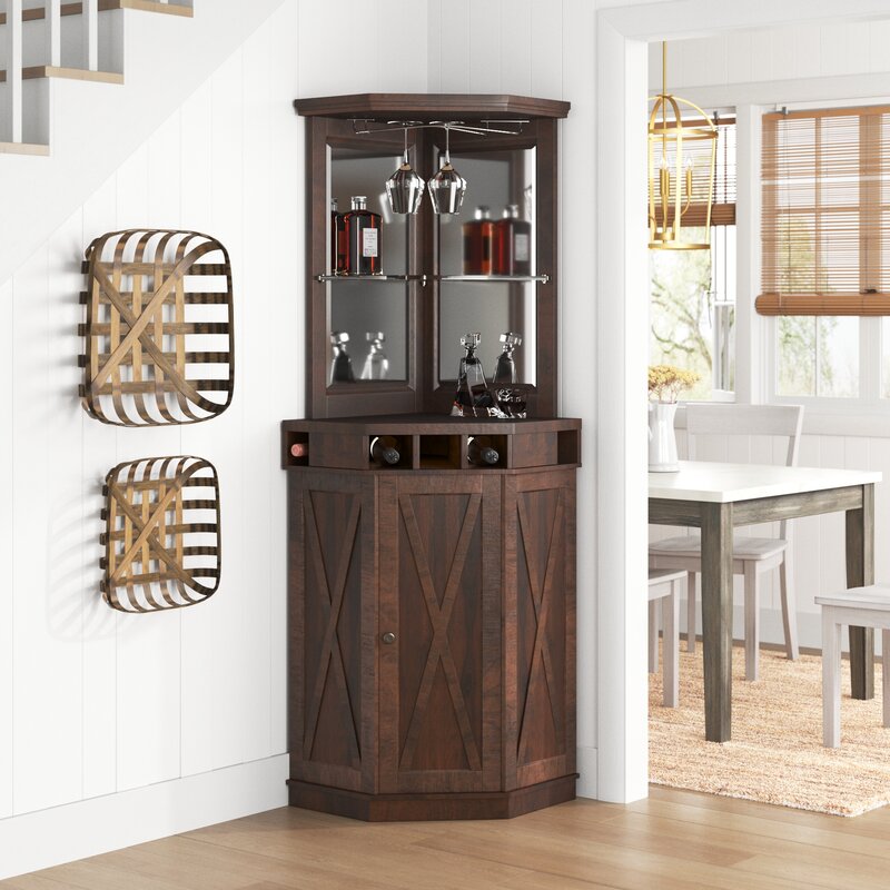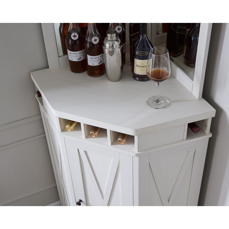 Add a bar to your space without taking up too much room with this Adam bar with wine storage. It’s made from wood in a distressed finish and features x-shaped designs on the base for a coastal farmhouse look. A single door in the base opens up to reveal an adjustable shelf where you can keep your spare barware, liquors, or mixers. Just below the tabletop is five cubbies where you can fit your favorite bottles of wine. Plus, this bar features an open-top shelf and a stemware rack. The back of this bar has two mirrored panels for a classic aesthetic.