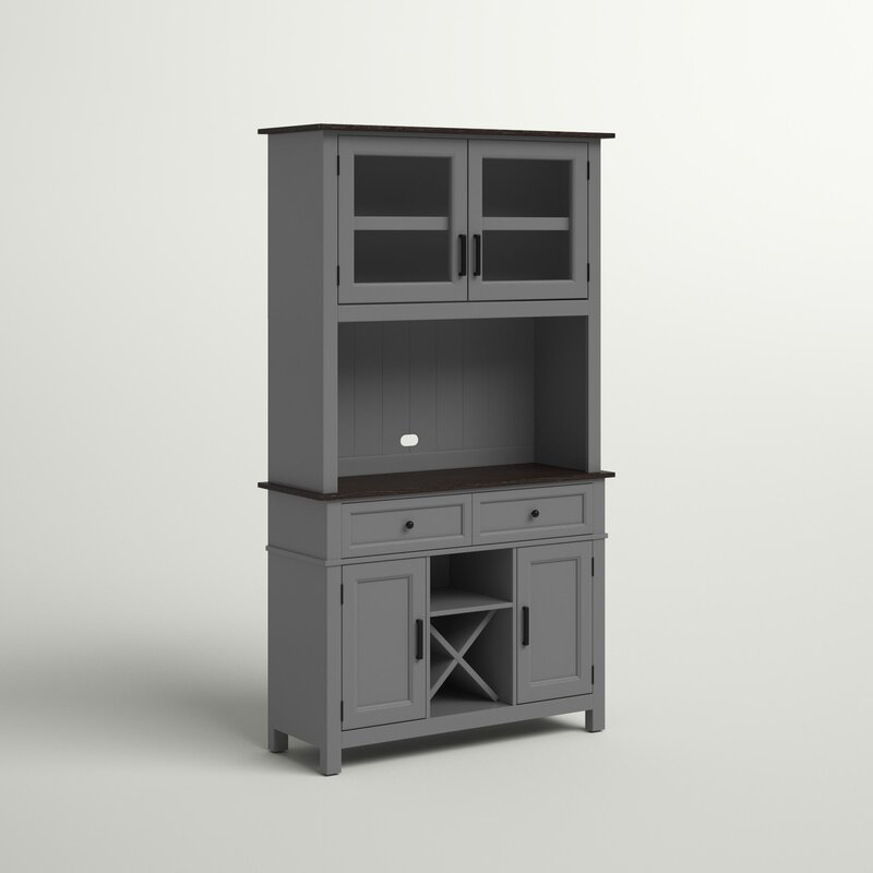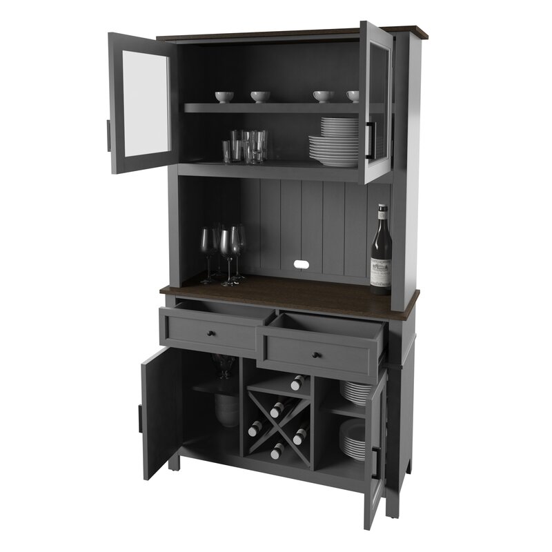This dining hutch adds a modern style with a farmhouse touch to your dining room or kitchen. It’s made of engineered wood with transparent glass and metal accents in a two-toned finish. This cabinet features a rectangular silhouette with an enclosed countertop over two drawers, two enclosed cabinets, an open cubby, and an X-shaped section for holding wine bottles. Above the counter, a paneled back supports two enclosed shelves with glass-front doors. We love that this dining hutch provides ample space for utensils, dishes, placemats, and even a spot for a microwave or serving tray.