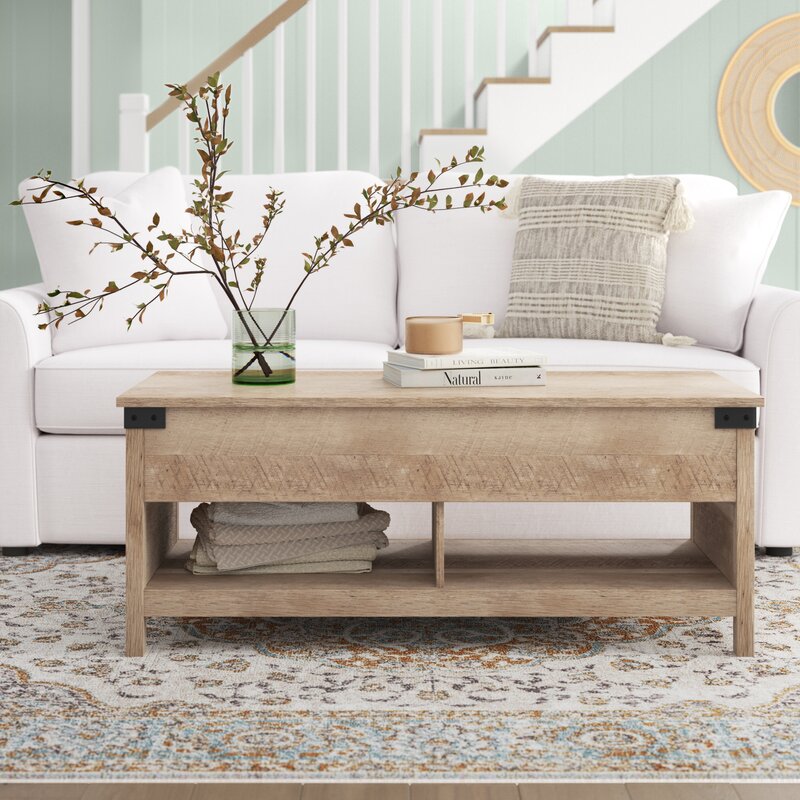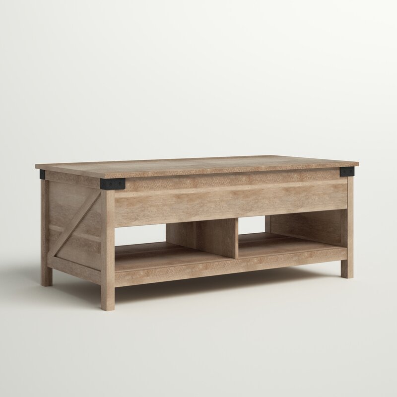 This lift-top coffee table brings smart storage and a farmhouse-inspired look to your living room. It’s made from engineered wood with a lintel oak finish and rustic metal corner brackets. We love that the tabletop rises up to meet you, providing a convenient surface for working – or snacking. Underneath, two hidden storage compartments keep your space tidy by giving you a place to stash throw blankets, DVDs, or charging cables. Plus, a lower open shelf with two compartments has plenty of room for books, remotes, or decorative items.