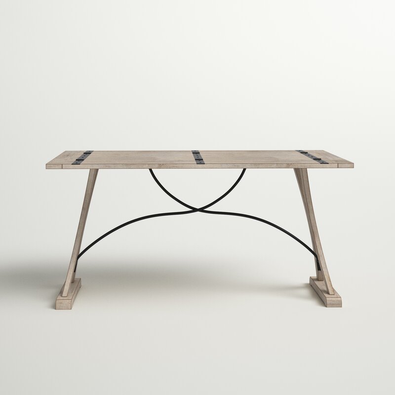 This drop-leaf dining table has a mix of black metal and beech-finished wood to create a coastal farmhouse aesthetic in your dining room. It’s made from solid acacia wood and has a trestle-inspired base with X-shaped legs and curving metal support bars for a distinctive silhouette. The tabletop has three metal bands stretched across it for additional industrial farmhouse charm. The two long edges of this table fold down, so you can have an 18″ or 36″ wide table for a breezy breakfast bar or center table for Sunday dinner. Overall, this table measures 60″ long, so you can fit four or six comfortably.