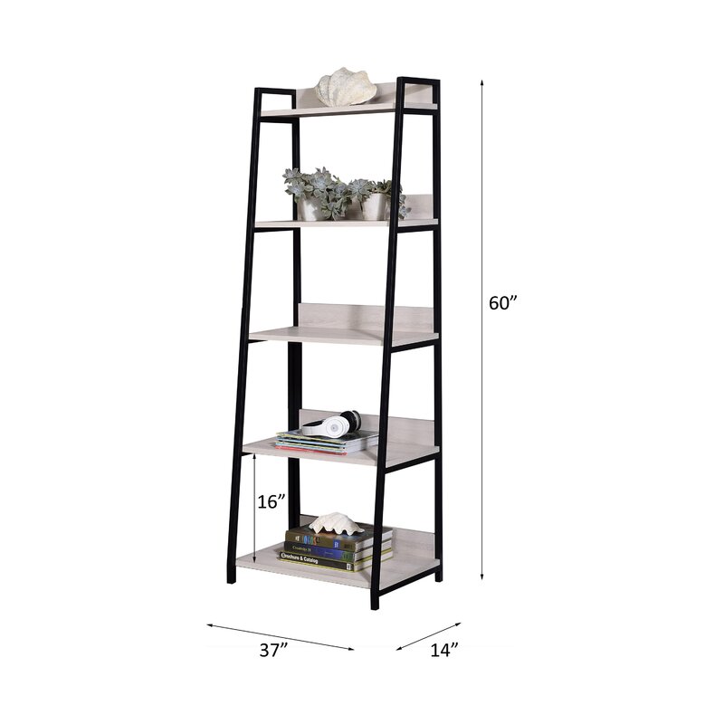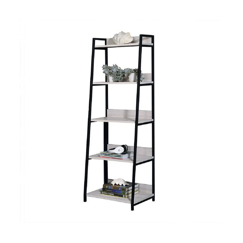 This ladder bookshelf brings a modern style with a coastal touch to your space. Crafted with a metal frame, this bookcase boasts engineered wood shelves in a white finish that adds a driftwood-like hue to this piece. It features an open frame with five-tiered shelves balanced between two A-shaped supports. We love that these shelves bring multifunctional storage options to your bathroom, kitchen, or bedroom. Its vertical orientation and 16” width makes this great for smaller rooms.
